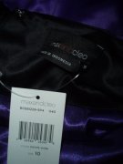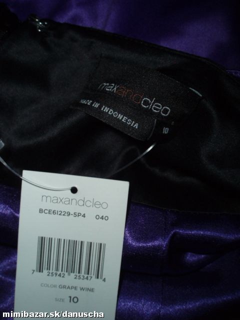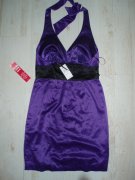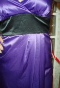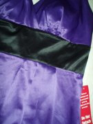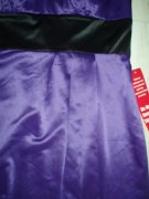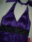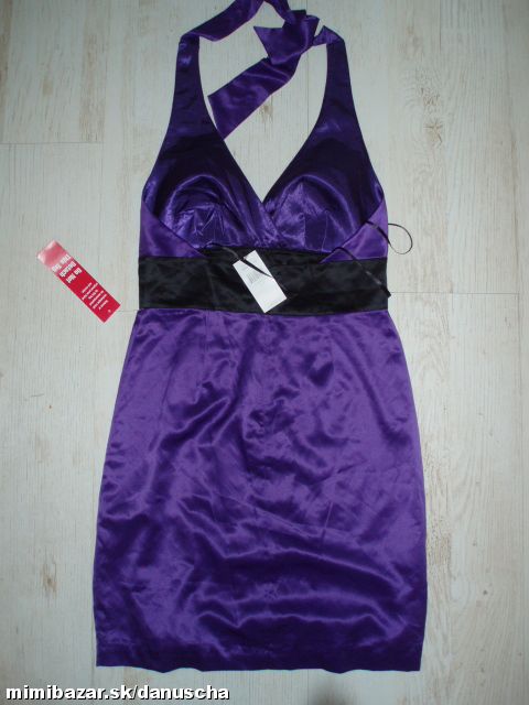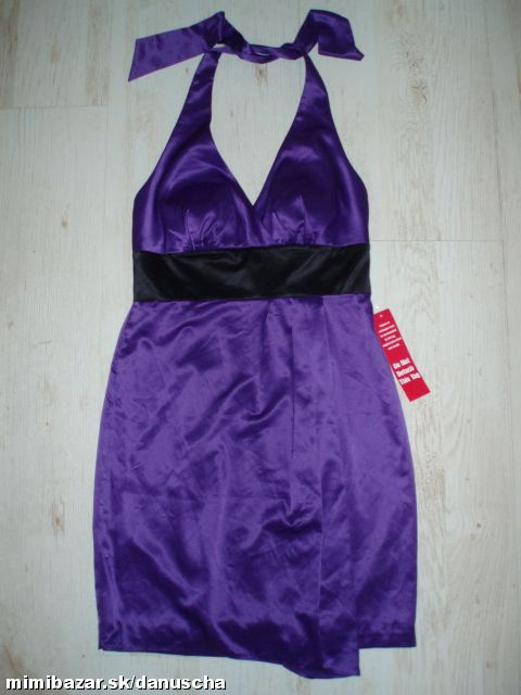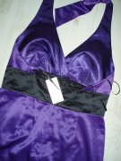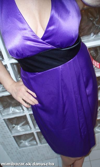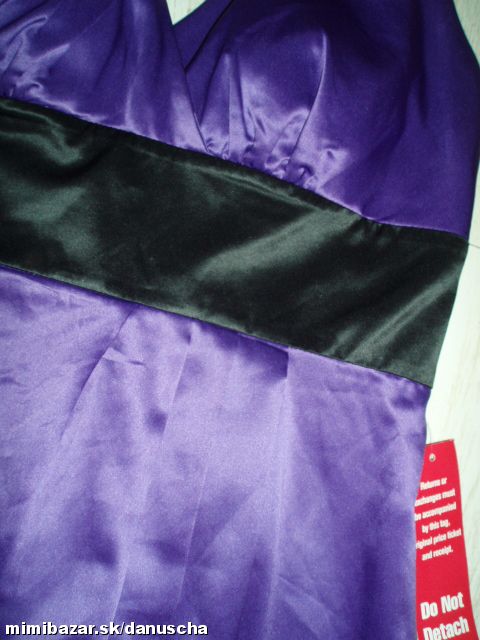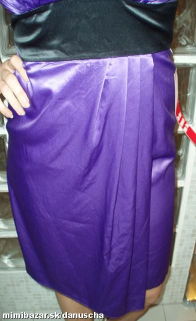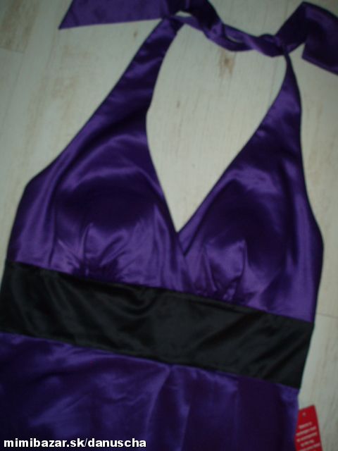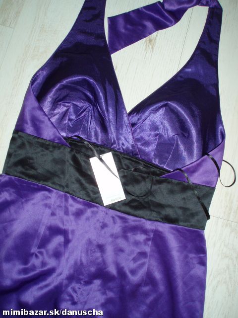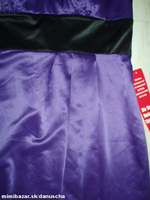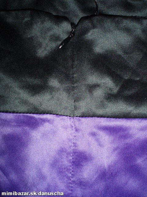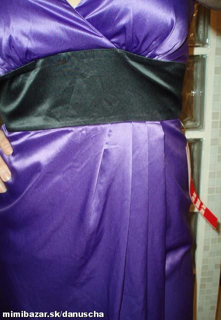 výrazná fialová v kombinácii s čiernou, kvalitný elastický satén, uväzovanie za krkom, pod prsiami vyztužené, vzadu sa zapínajú zipsom, zaujímavú súdková sukňa so skladmi vpredu, zakryje to bruško a zamaskuje prípadné nedostatky.