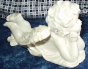 polyrezínový anjelik bielej farby si leží na brušku a tvrdo premýšľa nad osudom (svojho zverenca či seba?)... malý darček čo poteší ...maminku,tatina,starkú,ale aj lásku,kamošku či pani učiteľku ... veď život je občas zvláštny a každý z nás z času na čas potrebuje toho svojho anjelského ochrancu.