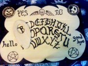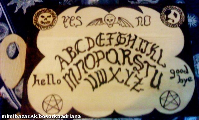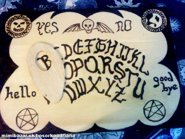 Zaujímalo by vás, kedy už konečne dostanete väčšiu výplatu?Chcete vedieť,čísla do športky?Pátrate po osudoch mŕtvych priateľov,príbuzných? Chcete nahliadnuť do budúcnosti?Alebo radšej odhaliť tiene minulosti?Opýtajte sa "hovoriacej tabuľky menom ouija" teda pokiaľ si trúfnete.Hovoriaca (čarodejnícka,špiritistická) tabuľka je prastarý spôsob komunikácie zo spirituálnym,teda záhrobným svetom a zakladá sa na princípe automatického písania.Prvé zmienky sú z 11.st.p.n.l. v Číne.Staroveká India,Grécko,Rím,ani Európa nezostáva pozadu.Ako vlastne tabuľka funguje?Použitie je veľmi jednoduché:chyťte indikátor=slzičku,zakrúžte ňou 3xdookola uprostred tabuľky a začnite sa pýtať.Ale pozor!Nikdy sa nepýtajte sami!nepoužívajte Ouiju,pokiaľ ste chorí,unavení,oslabení!nie na cintoríne či mieste,kde sa odohrala vražda ,tragédia!nenechávajte indikátor na otvorenej tabuľke,pokiaľ ju nepoužívate!NEPÝTAJTE SA NIKDY na to,kde je zakopaný poklad,či existuje Boh,na dátum svojej smrti!