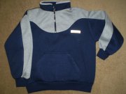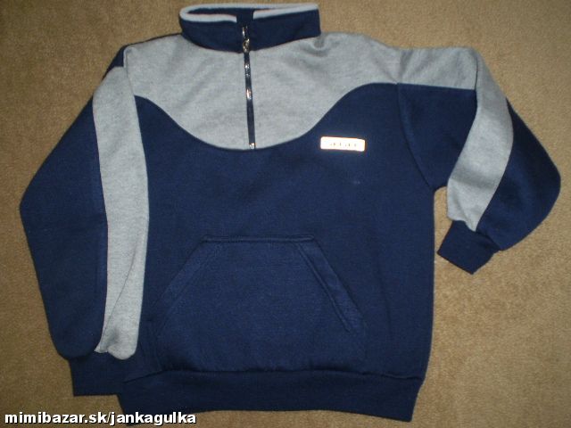 Modro-šedá mikina na zips ku krku, klokanie vrecko. Nosená, zachovalá. Rozmery: šírka 41 cm, dĺžka 44 cm, rukáv od pleca 38 cm, šírka pleca 12 cm. Veľkosť je udaná 134, ale je menšia, premerajte