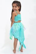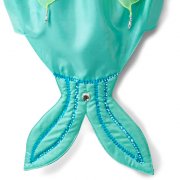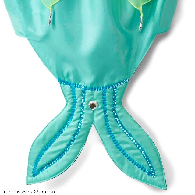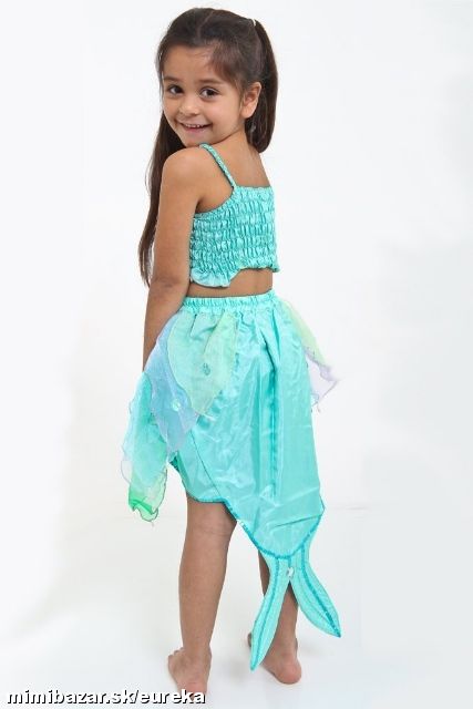 IHNEĎ K ODBERU! Dvojdielny kostým morskej panny - vršok a sukienka na gumičku s chvostom na zadnej strane. Kostým má pekné detaily. Vrchný diel je elastický - prispôsobí sa postave. Pás sukne v kľudnom stave je 23 cm, roztiahne sa na cca 45 cm, dĺžka sukne aj s chvostom je 73 cm. Vrchný diel celková dĺžka aj s ramienkami 32 cm, šírka v kľude 26 cm. Vyrába anglická firma LucyLocket. Veľkosť 128 cm.