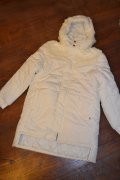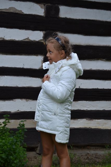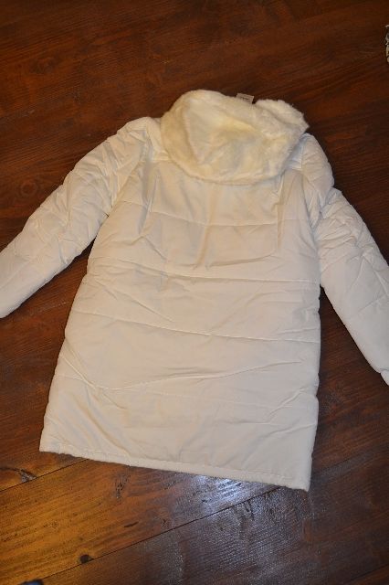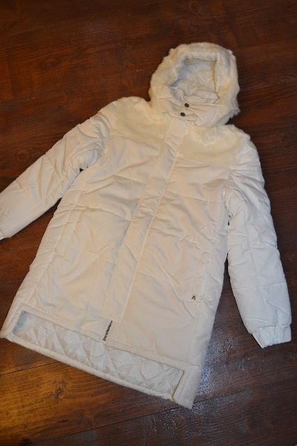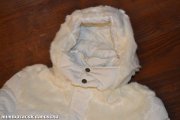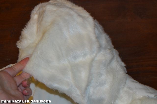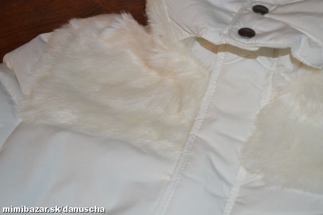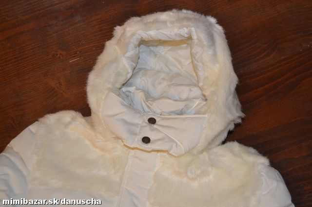 teplá, aj do najväčšej zimy. biela / krémová farba, vatovaná, štepaná podšívka, rukávy ukončené širšími manžetami s všitou gumou, zadný diel je trochu dlhší ako predný, kapucňa má z vonkajšej strany umelú kožušinu v rovnakej farbe, rovnaká kožušina je našitá aj vpredu na ramenách...