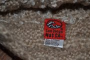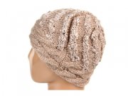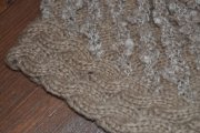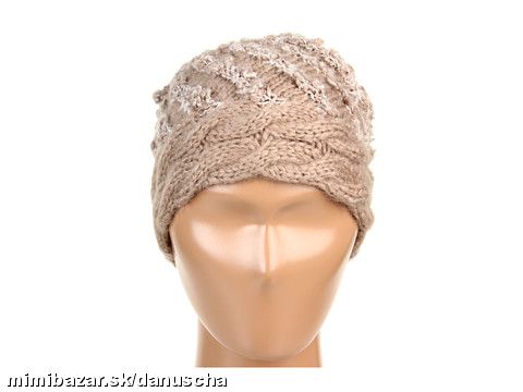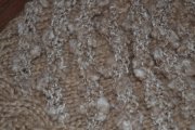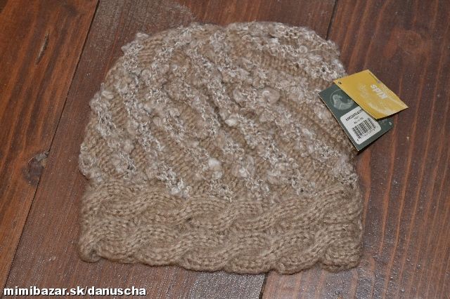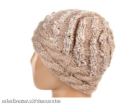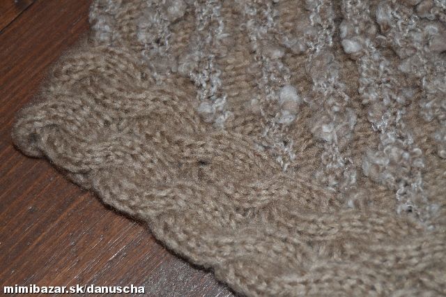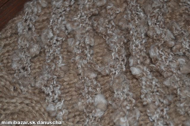 hnedá farba, kombinácia viacerých vzorov, dole osmičky, hore votkaná hrčkavá priadza s leskom.