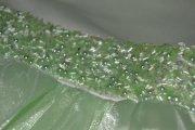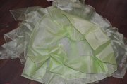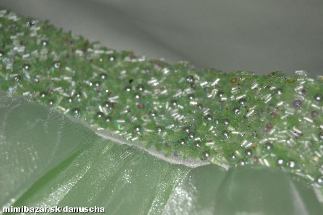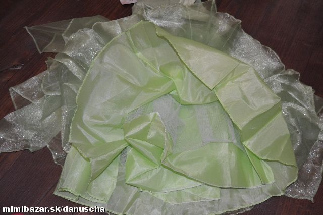 saténový vrch bez rukávov, v páse korálky, asymetrická niekoľkovrstvová sukňa, dĺžka po členky...