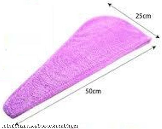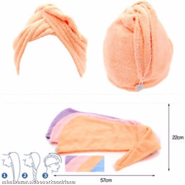 Špeciálne vlásočnice rýchlo absorbujú vodu z mokrých vlasov,skôr ich osušia a vy tak ušetríte kopec času.Je pohodlný a mäkký,omnoho ľahší ako bežný uterák a tak ušetríte aj kopec miesta v batožine smerujúcej na dovolenku či pracovnú cestu....Vďaka šikovnému zavinovaciemu a upevňovaciemu systému sa ani pri prudkom pohybe nezošmykne z hlavy.Jednoducho ho položíte na hlavu ako čiapku,vpredu spravíte vrkoč,prehodíte dozadu a prichytíte gombíkom.Vhodné aj pre deti :-D.Ide o NOVÝ tovar.Farba fialková (ako v detaile č.2).