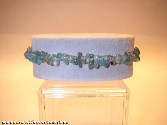 Náramok z apatitu na gumičke,veľkosť kamienkov do cca 0,8 cm.Tento minerál sa ako drahý kameň spracováva zriedkavo a vačšinou len pre zberateľov Keď sa však správne vybrúsi,je žiarivopriezračný a má výrazné sfarbenie. Jeho tvrdosť je 5.Pôsobí pozitívne v prípadoch uzavretosti,lenivosti,nerozhodnosti,apatie,pri chorobách kĺbov a kostí, rachitíde,artróze,zlomeninách a črevných problémoch.Rovnako pomáha pri obnove buniek,ťažkostiach tráviaceho traktu,podporuje imunitný systém.Posilňuje otvorenosť, spoločenskosť,cieľavedomosť,dynamickosť a bystrosť.Pomáha pri obezite.Astrologicky súvisí so znamenie Blíženci, Vodnár