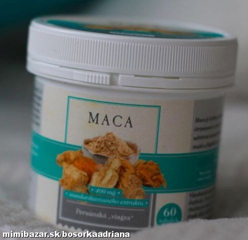 Maca je bylina pôvodom z peruánskych Ánd.Používa sa pri vyčerpanosti a únave,na zlepšenie fyzickej aj psychickej výkonnosti. Pomáha udržiavať sexuálnu aktivitu a plodnosť a to u mužov aj žien.Je vhodné ju žívať ju pri erektabilných disfunkciách (impotencii) u mužov či frigidite žien,ale rovnako výkonne funguje,ak sa neúspešne snažíte o bábätko a zatiaľ sa vám nedarí,pretože nie je v poriadku hormonálny profil. Maca je tiež vhodná na podporu mozgovej činnosti (napr.pri práci v noci či pred skúškami,pri učení a pod.) V balení je 60 želatínových toboliek plnených mletým koreňom maca z peruánskych Ánd bez konzerventov,príchutí či farbív.