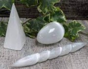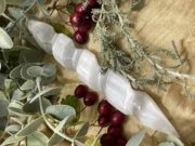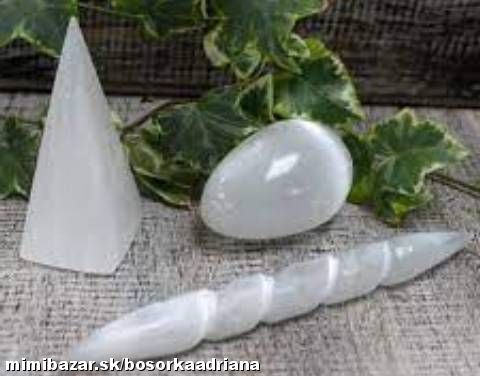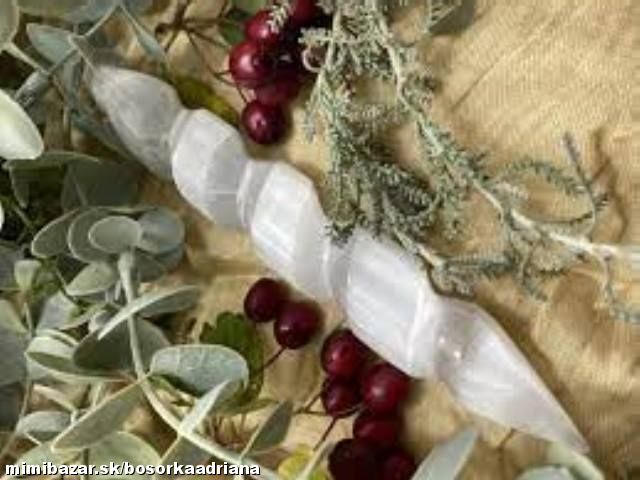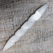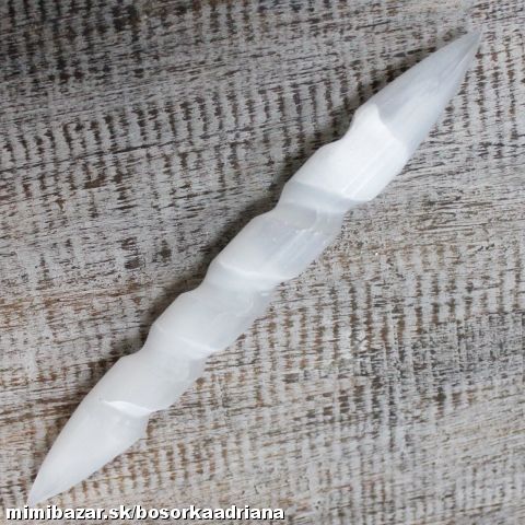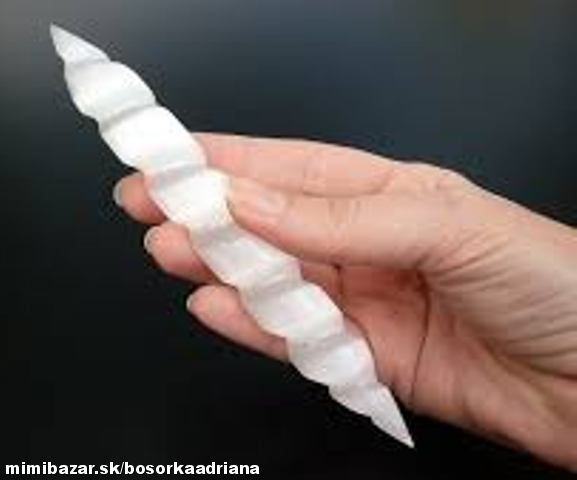 Selenit je pomenovaný podľa gréckej bohyne Mesiaca=Seléne.Býva priraďovaný ženám,ako "ich kameň".Je priesvitný s vláknitou štruktúrou a ryhovaným vzorom.Jeho najznámejšie náleziská sú v USA,Mexiku, Rusku,Rakúsku,Poľsku,Maroku...Najbežnejšie je v bielej farbe,ale môže sa vyskytnúť aj v oranžovej,hnedej,modrej či zelenej.Patrí k znameniu Býk.Vibruje so 7mou vyššou korunnou čakrou.Vnáša jas do situácie,otvára spojenie s vyšším vedomím a duchovným sprievodcom.Vvzbudzuje v človeku mier a pokoj,preto je vhodný pre meditáciu a prácu s duchovnom.Najrýdzejší priesvitný biely Selenit je obdarený nadpozemskými vlastnosťami.Je možné použiť ho na vytvorenie ochrannej mriežky okolo osoby,na upokojenie priestoru, kde nemajú zasahovať vonkajšie vplyvy. Vytvára pokojnú a mierumilovnú atmosféru.Špirálovitú tyčinku používame pri čistení aury od cudzích entí,pri preventívnej ochrane voči čomukoľvek,čo by mohlo ovplyvniť myseľ.Narovnáva chrbticu a zvyšuje jej ohybnosť. Chráni pred epileptickými záchvatmi.Neutralizuje pôsobenie ortuti v zubnom amalgáme a vyrovnáva pôsobenie "voľných radikálov".Výška cca 15cm, šírka cca 2cm.Každá špirálka je originál,preto nečakajte 2 absolútne rovnaké kusy ...môžu sa líšiť farbou,leskom,vzorkovaním,... nemôžem odfotiť všetky kusy,čo sú na sklade! Lokalita ťažby kameňa: Maroko
