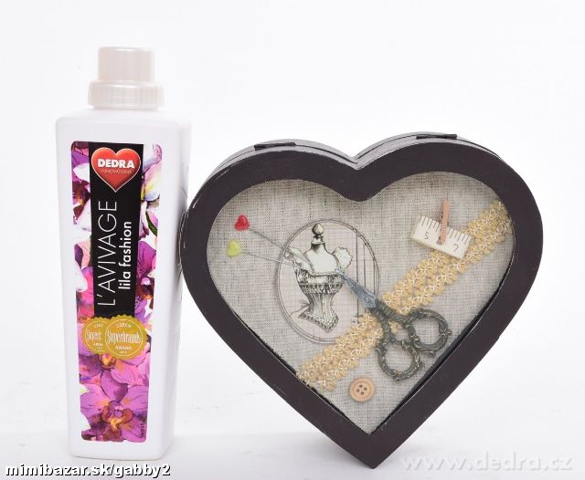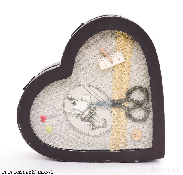 Dřevěná dóza ve tvaru srdce s odklápěcím víkem, ve vrchní části víka pod sklem dekorace v podobě šicích potřeb.