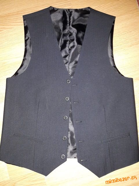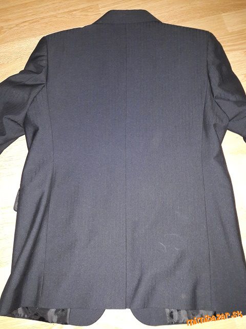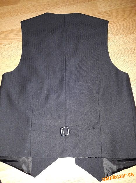 Predám čierny oblek s jemným prúžkom pre chlapca vo veku 14 - 15 rokov . rn Rozmery:rn sako: celk. dĺ.:72, cm, šírka v ramenách : 42 cm, šírka pod pazuchami: 2 x 50 cm, rukáv od krku: 75 cm, rukáv od ramena: 61 cmrn nohavice: celk. dĺ : 95 cm, od rozkroku dolu: 69 cm, šírka v páse: 2 x 40 cm, možnosť dať opasokrn vesta: celk. dĺ. 55 cm, šírka pod pazuchami: 2 x 45 cm.