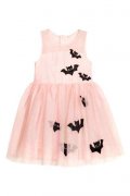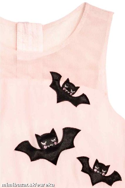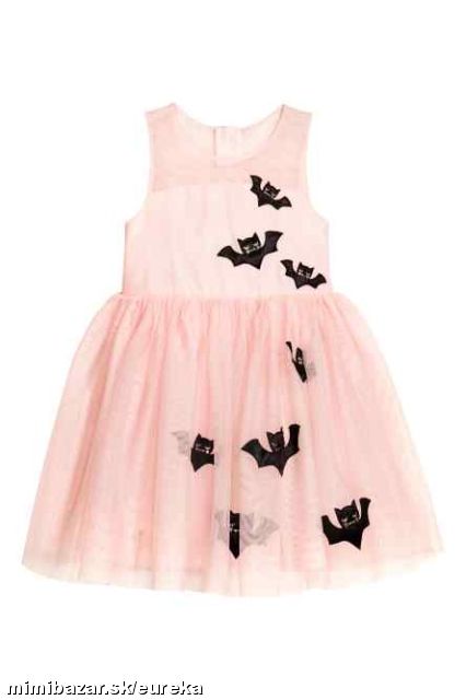 IHNEĎ K ODBERU! Vhodné na vek 4 - 5 rokov, veľkosť 110, celková dĺžka cca 63 cm, zapínanie vzadu na zips, značka H&M. Krásne nadýchané jemné šiatky z tylu sú vhodné pre akúkoľvek spoločenskú udalosť. Na šiatkach je aplikácia malých netopierov, preto sú vhodné aj na karneval. Vrchný diel je podšitý saténom, sukňová časť má 2 vrstvy tylu. Pôvodná cena 25,00 eur.