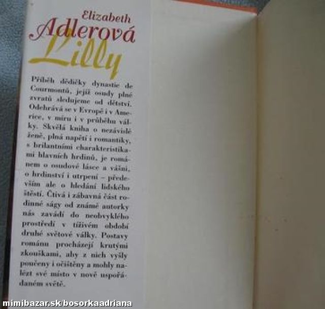 Kto pozná knihy od Elizabeth Adler,tomu je väčšinou jedno,či ju číta v českom alebo slovenskom jazyku ...Ženský román z prostredia amerického automobilového priemyslu volne nadväzuje na román Leonie.Ak ste ho však nečítali,ani teraz nebudete ochudobnení,lebo táto kniha je samostatný príbeh...Autorka sleduje životnú dráhu krásnej dedičky upadajúcej americkej automobilky od jej detstva.Dej sa odohráva v Európe aj v Amerike od doby pred 2.sv.vojnou až do doby povojnového priemyslového rozmachu. Lilly je bohatá a nezávislá žena,ktorá si prešla nevydareným manželstvom a začne sa zaujímať o zdedenú firmu,kde nájde nielen nového manžela,ale aj muža,ktorý upadajúcemu podniku vdýchne nový život a vráti mu bývalú slávu.Kniha je NEČÍTANÁ,dostala som ju ako darček,no mám rovnakú len v slovenskom vydaní (pod názvom Broskynka).Cena je menej než polovica nadobúdacej,takže z 12€ na 4.99!
