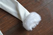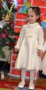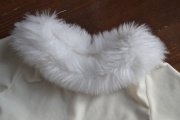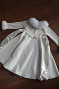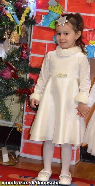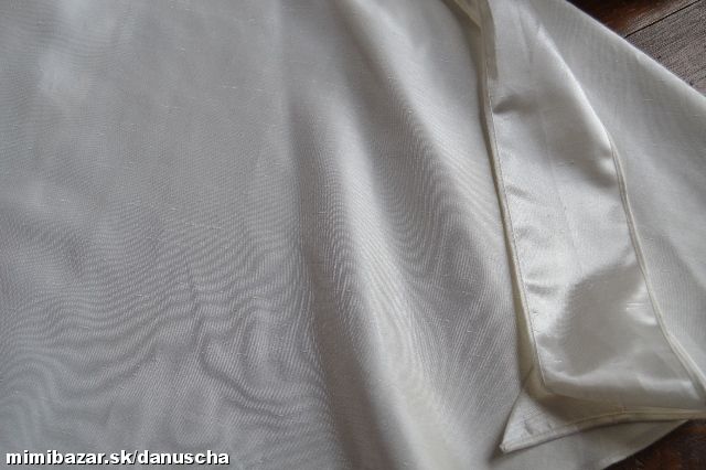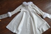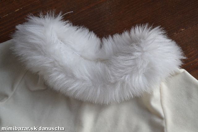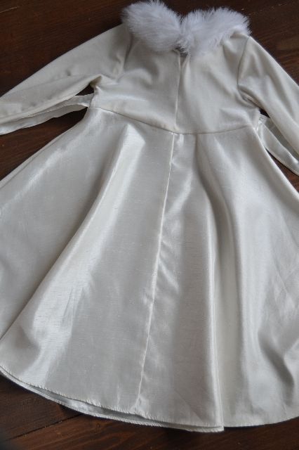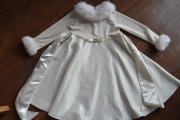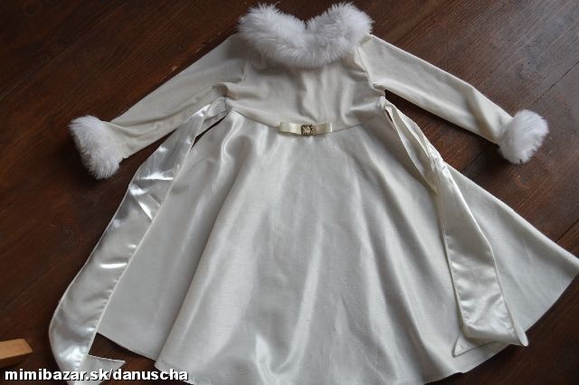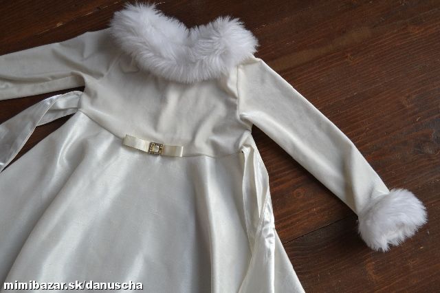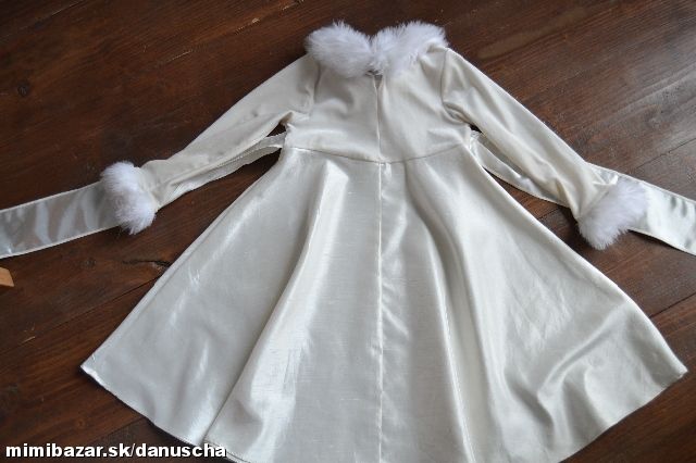 slonovinová farba, lemované umelou kožušinou, hore elastický zamat, široká kruhová sukňa z luxusného akoby surového hodvábu. široký opasok s uväzovaním na chrbte...