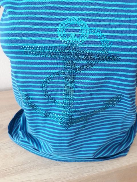Tyrkysové tričko s lesklou kotvou. Nosené, zachovalé. Má jednu maličkú dierku. Vhodné pre dámy veľ. /S, alebo dievčatá 164