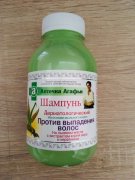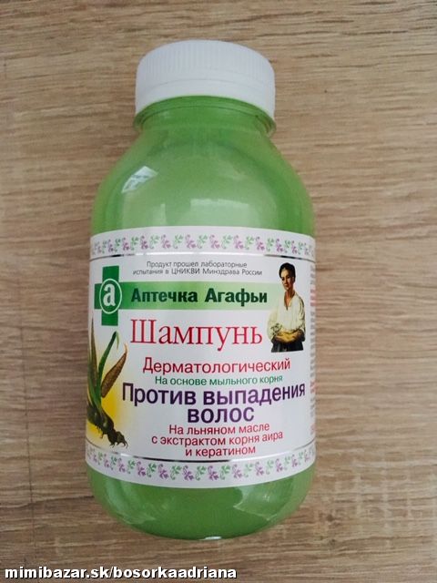 Rad Agátina lekárnička je tvorená spojením ľudových receptov sibírskej bylinkárky Agáty a moderných kozmetických postupov.Receptúra šampónu proti vypadávaniu vlasov je obohatená koreňom mydlice lekárskej,ľanovým olejom,extraktom z koreňa puškvorca (tradičným prostriedkom používaným pri začínajúcom plešatení) a keratínom (elastická bielkovina obsiahnutá vo vlasoch a nehtoch).Proti vypadávaniu vlasov pri začínajúcom plešatení zlepšuje ich pružnosť.Šampón nanášame na mokré vlasy a ľahko masírujeme do vytvorenia peny. Necháme pôsobiť 2-3 minútky a opláchneme čistou vodou.