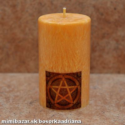 veľkosť sviečky je cca 6 x 10cm,použitý je palmový vosk,farba zlatožltá s hnedočerveným vzorom pentagramu v kruhu.Ručná práca