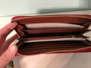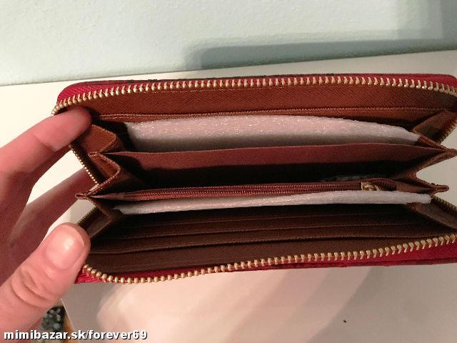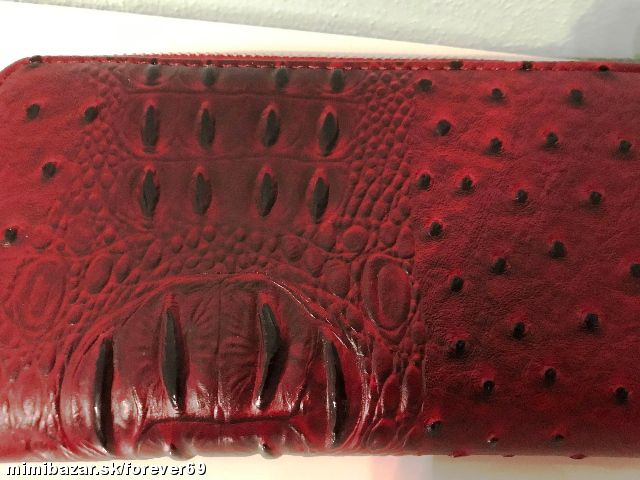 bordovej farby s plastickým vzorom. Kupovaná v USA. Vo vnútri 3 veľké priehradky, jedna priehradka na zips, + 6 priehradok na karty.