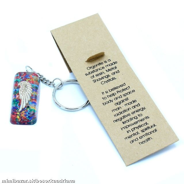 Orgonit je zariadenie,ktoré vie spracovávať orgónovú energiu.Je to zmes katalyzovanej živice zo sklených vlákien s kovovými hoblinami naliatych do foriem.Jeho prínos je v tom,že negatívnu energiu dokáže zmeniť na pozitívnu.Dokáže zároveň pôsobiť proti elektromagnetickému žiareniu,ktorým je človek v modernom svete obklopený.Orgonit čistí a harmonizuje priestor okolo vás,robí ho príjemnejším.Dokáže vytvoriť dobrý pocit a nemusíte ani vedieť,prečo je vám na danom mieste dobre,ale cítite,že je tam príjemne.Neutralizuje elektromagnetický smog z televízorov,rádií,mobilov,monitorov,elektrických rozvodov...Niektorí ľudia tvrdia,že môžu spať lepšie a hlbšie s orgonitom v spálni.Tento je v tvare platičky so zaliatym anjelským krídlom pre OCHRANU osobnosti.Ide o NOVÝ tovar,vhodný aj ako darček.Dodávaný v darčekovom vrecúšku.Ak dáte dolu veľký kľúčový krúžok,môžete nosiť na koženej šnúrke ako bežný prívesok