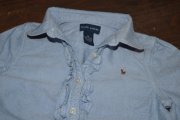 k tomu nádherná bavlnená modrá košielka s volánikmi okolo zapínania, viacfarebné logo na hrudi, okrúhly golierik podšitý farebnou látkou, ako nová, neviem či vôbec oblečená...