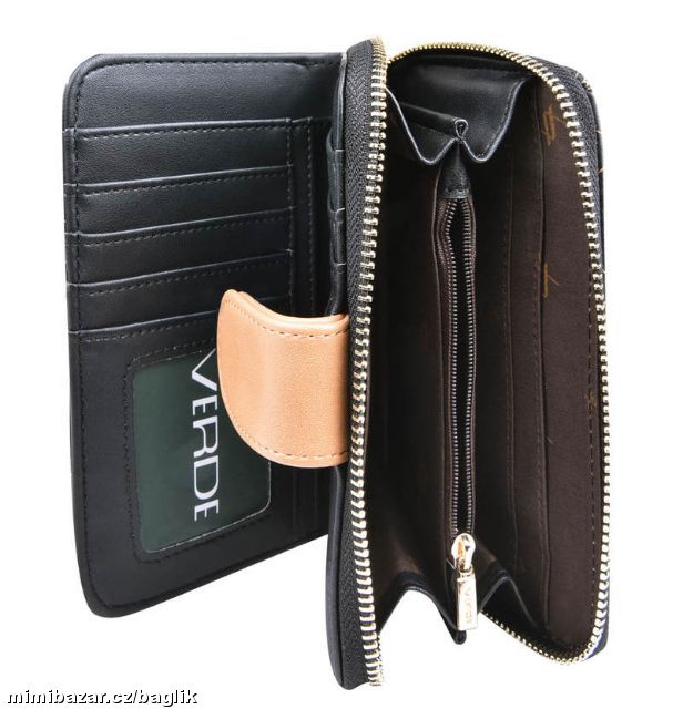 Jedna část je zapínatelná s klopou na cvoček. Uvnitř je pět velkých kapsiček a osm slotů na karty či doklady.