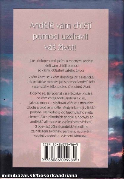 V každom okamihu ste obklopení milujúcimi a mocnými anjelmi,ktorí vám chcú pomôcť so všetkými oblasťami vašeho života.Stačí len o ich pomoc požiadať! Vtejto knihe sa k Vám dostávajú praktické metódy,ako s pomocou anjelov vyliečiť vzťahy,telo,zamestnanie či rodinný život.Dozviete sa,ako spoznáte Vaše Božské poslanie,čo Vám hovoria anjelské čísla,ako Vás môžu ovplyvňovať zážitky z minulých životov a prečo sa anjeli niekedy reinkarnujú v ľudskej podobe.Nechýbajú ani anjelské afirmácie na zvýšenie sebavedomia,modlitby za nájdenie životného partnera,vyliečenie vzťahov v rodine,či vyliečenie smútku.Anjeli sú medzi nami! Dnes dokonca viac,než inokedy a to nielen v obchodoch či reklamách.Počet ľudí,ktorí rozprávajú o stretnutí s nimi neustále rastie.Anjeli im pri týchto stretnutiach podávajú svoje posolstvá,pomáhajú uzdraviť sa či zachránia život ako taký.