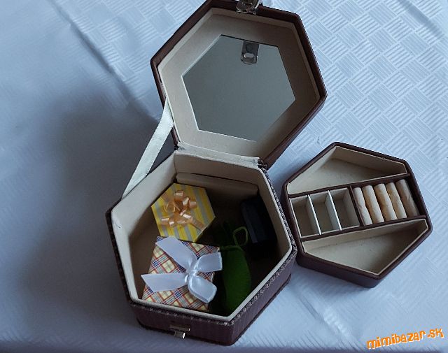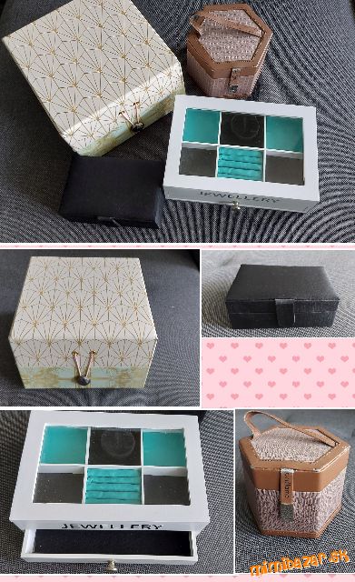 ponúkam šperkovnice ktoré už nepoužívam,kúpila som si jednu velkú tak posúvam ,snád niekto využije,hnedá je vydieť trošku poškodená ale inak sa dá využiť,čierna je bez poškodenia, posledná čierna s mašličkou je nová nepoužitá,vhodná ako darček PC 24.99,teraž 7.00 ,velká krémová 4.50, biela je mňou vylepšená,tyrkisovo čierny saten som tam dala ja,dá sa pohdlne vybrať 5.00,hnedá 2.00,čierna 1.50,čierna s mašličkou 7.00