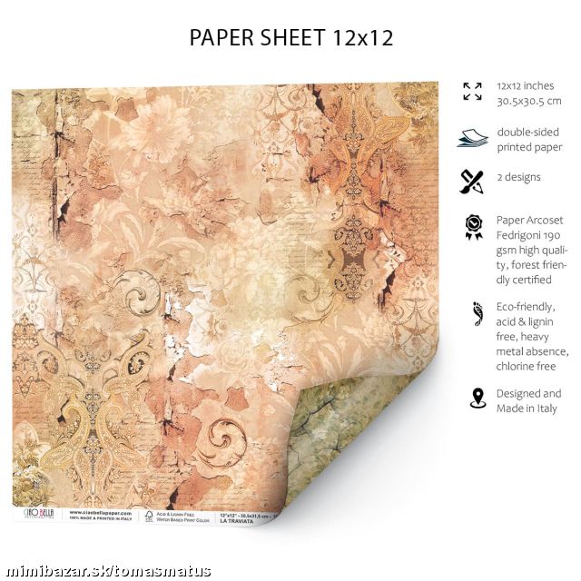 Obojstranne potlačený farebný papier archivačnej kvality LA TRAVIATA je vhodný na tvorenie scrapbookovou technikou. Veľkosť 30,5x30,5 cm resp. 12x12 inch. Cena je uvedená za 1 ks. Mám viac kusov.