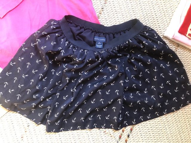 modrá sukňa s kotvami, v páse guma, úžasný materiál 13€.