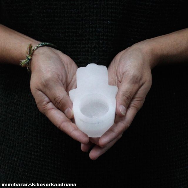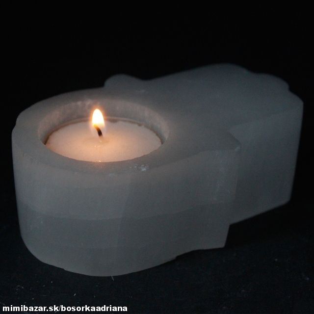 Selenitový svietnik na čajovú sviečku v tvare ochrannej ruky HAMSA.Selenit je pomenovaný podľa gréckej bohyne Mesiaca=Seléne.Býva priraďovaný ženám,ako "ich kameň".Je priesvitný s vláknitou štruktúrou a ryhovaným vzorom.Jeho najznámejšie náleziská sú v USA,Mexiku, Rusku,Rakúsku,Poľsku,Maroku...Najbežnejšie je v bielej farbe,ale môže sa vyskytnúť aj v oranžovej,hnedej,modrej či zelenej.Patrí k znameniu Býk.Vibruje so 7mou vyššou korunnou čakrou.Vnáša jas do situácie,otvára spojenie s vyšším vedomím a duchovným sprievodcom.Vvzbudzuje v človeku mier a pokoj,preto je vhodný pre meditáciu a prácu s duchovnom.Najrýdzejší priesvitný biely Selenit je obdarený nadpozemskými vlastnosťami.Je možné použiť ho na vytvorenie ochrannej mriežky okolo domu,na upokojenie priestoru, kde nemajú zasahovať vonkajšie vplyvy. Vytvára pokojnú a mierumilovnú atmosféru.Tyčinku používame pri čistení aury od cudzích entí,pri preventívnej ochrane voči čomukoľvek,čo by mohlo ovplyvniť myseľ.Narovnáva chrbticu a zvyšuje jej ohybnosť. Chráni pred epileptickými záchvatmi.Neutralizuje pôsobenie ortuti v zubnom amalgáme a vyrovnáva pôsobenie "voľných radikálov".