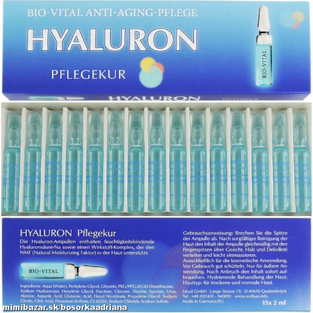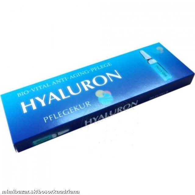 Kyselina hyalurónová je dôležitou súčasťou ľudského tela, najmä pre pokožku. Zadržiavana množstvo vody a dodáva pokožke viac objemu a prispieva ku krajšiemu vzhľadu.Ponúka Vám vysoko kvalitnú aplikáciu proti starnutiu,omladzujúci účinok na pokožku,vyhladenie vrások,dodáva pokožke väčší objem,viaže veľké množstvo vody.V balení je 15ampuliek po 2ml Hyaluron Cosmetics s omladzujúcimi účinkami s kyselinou hyalurónovou