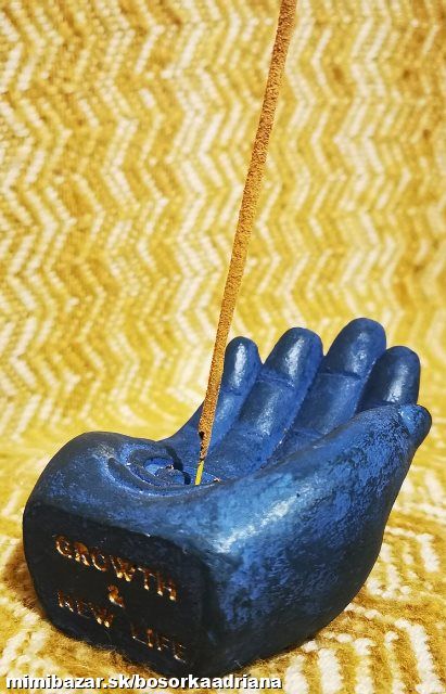 Modrá ruka=držiak na vonné tyčinky a kužele je vyrobená z kameňa a natretá petrolejovomodrou farbou.Umocnená symbolom špirály podporuje plodnosť (nielen detí,ale aj hojnosti,dostatku,lásky,úspechu,príležitostí...). Pálenie kadidla podporuje relaxáciu,podporuje koncentráciu,stimuluje kreativitu,zvyšuje motiváciu. Jednoducho zapáľte kadidlo pre príjemnú vôňu v obývačke,kancelárii,masážnom či fitness salóne alebo ho použite na konkrétny účel. v obchode či doma.Ak potrebujete adekvátne vonné tyčinky alebo kužele,mrknie sa ku mne do MMB alebo na MMA :-