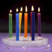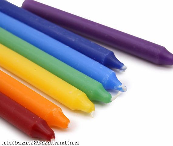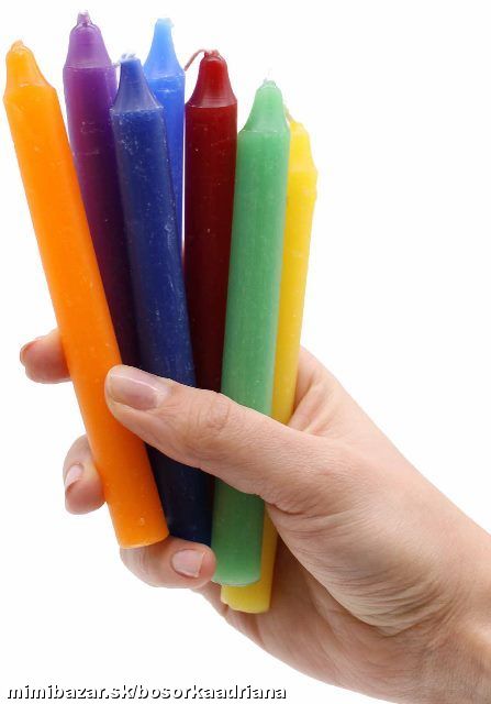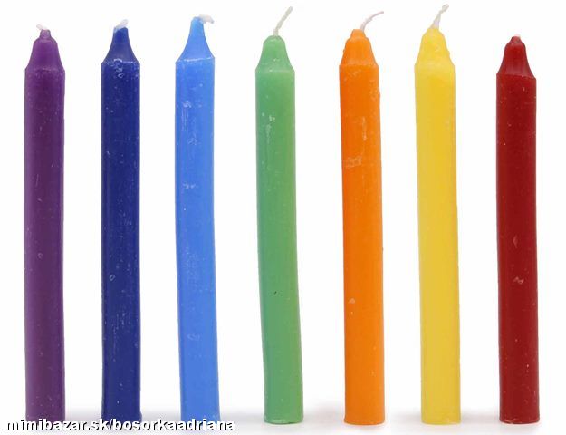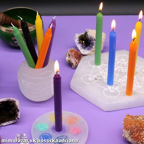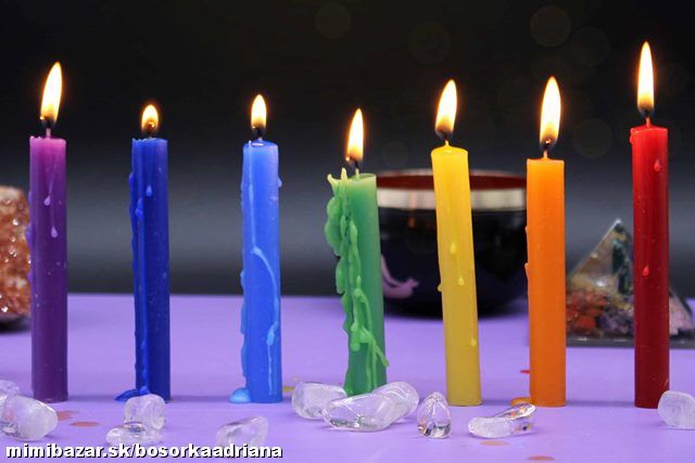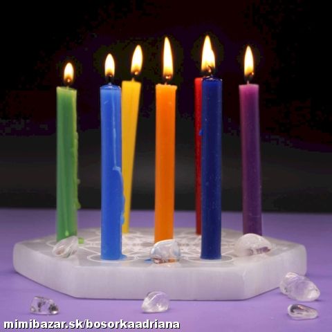 V tejto sade nájdete 7 rôznofarebných sviečok,zložených vo vzájomnej harmónii,odkazujúcich na energetické centrá v ľudskom tele(čakry).Pomôžu vám dosiahnuť pokoj a rovnováhu.1.Muladhara =ČERVENÁ základná čakra,kt.sa nachádza v spodnej časti chrbtice,riadi inštinkty,je zodpovedná za fyzickú silu,telesné zdravie. 2.Swadhishthana=ORANŽOVÁ sakrálna čakra,kt.a nachádza 3cm pod pupkom.Je zodpovedná za sexualitu,kreativitu,emócie. 3.Manipura=ŽLTÁ solárna čakra,v oblasti solar plexu(prostriedok brucha).Stimuluje vnútornú silu,posilňuje intelekt. 4.Anahata=ZELENÁ srdcová čakra,zodpovedná za lásku a vzťahy s blízkymi. 5.Vishudda=TYRKYSOVÁ krčná čakra,kt.ovplyvňuje komunikáciu,reč,jasnosť správy,sebavyjadrenie. 6.Ajna=INDIGO čakra tretieho oka sa nachádza približne na úrovni obočia.Je zdrojom intuície,spája telo s duchom. 7.Sahasrara=FIALOVÁ korunná čakra,kt.sa nachádza tesne nad temenom hlavy, je kanálom pre duchovný život,spája človeka s vesmírom. Veľkosť jednej sviečky: 2,5x1cm,farba podľa čakry.Na MMB sú aj selenitové podložky vhodné pod sviečky