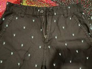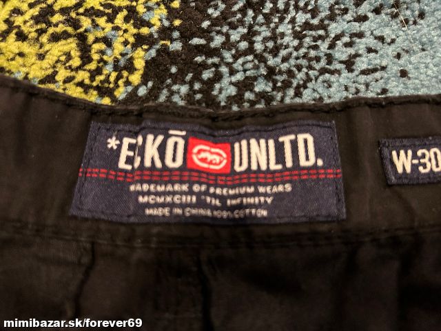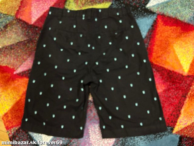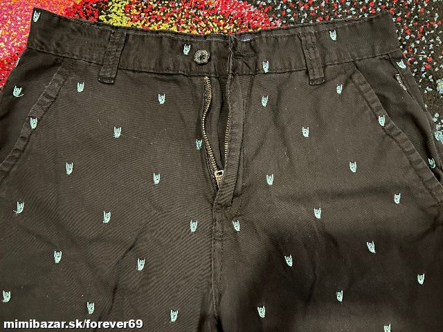 čiernej farby s vyšívanými tyrkysovými znakmi . kupované v USA, v perfektnom stave. uvedená veľkosť W 30, také M. Materiál 100% bavlna, podobná riflovine: Vpradu dve vrecká, vzadu 2 vrecká