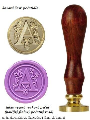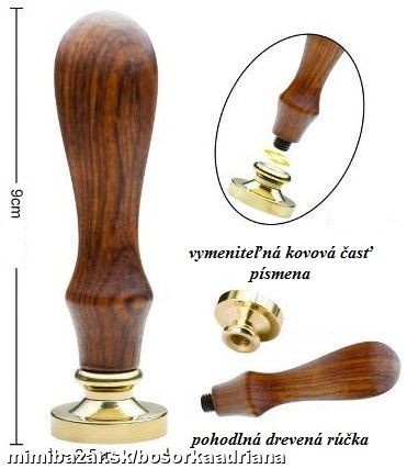 Chcete byť originálny? Ja viem,dnes už listy posiela málokto,všetci bláznia smskami,ale občas sa oplatí byť iný ... či už pri balení darčekov,osobných venovaní,dokumentov,tajných lístkov,ak chcete,aby ste mali istotu pri doručovaní balíkov a pod.... Používa sa s VOSKOM (ako kedysi za dávnych čias blahej pamäti) :-D,nenamáča sa do farby... Pečatný vosk sa dá kúpiť aj v papiernictve no takúto osobnú pečať tam nezoženiete ... Ide aj o skvelý darček pre niekoho,kto chce byť iný,ako všetci okolo ... Pečať má kvalitnú drevenú rúčku a písmenko sa dá odmontovať a vymeniť za iné (alebo za iný obrázok).Kovová pečať sa nešpiní ani po použití,hoci je dobré občas je vyčistiť...Dodávané v krabičke.Ide o NOVÝ nepoužitý tovar,JEDINÝ kus v predajni !!!