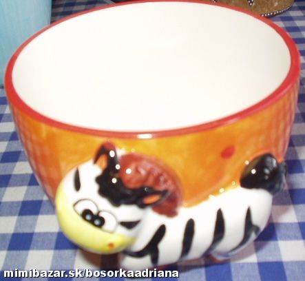 Oranžová šálka či miska - na musli, pudinček, polievočku či kukuričné lupienky ...na čo len chcete :-)) - v prednej časti má figúrku zebry.Potešte svojho miláčika ! Ide o nový tovar - dovoz z Holandska. Je možné ju dať aj ako darček. Výška 9,5cm, šírka 11,5 cm. Zmestí sa do nej cca 3,00 - 4,50 dcl tekutín (podľa toho, ako ju chcete mať plnú :-)...).