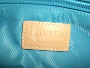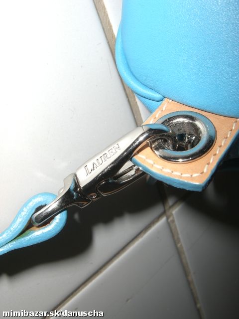 vo vnútri futrovaná tyrkysovou lesklou látkou posiatou logami. kovové diely sú striebornej farby, na karabínkach vyrazené logo LAUREN.